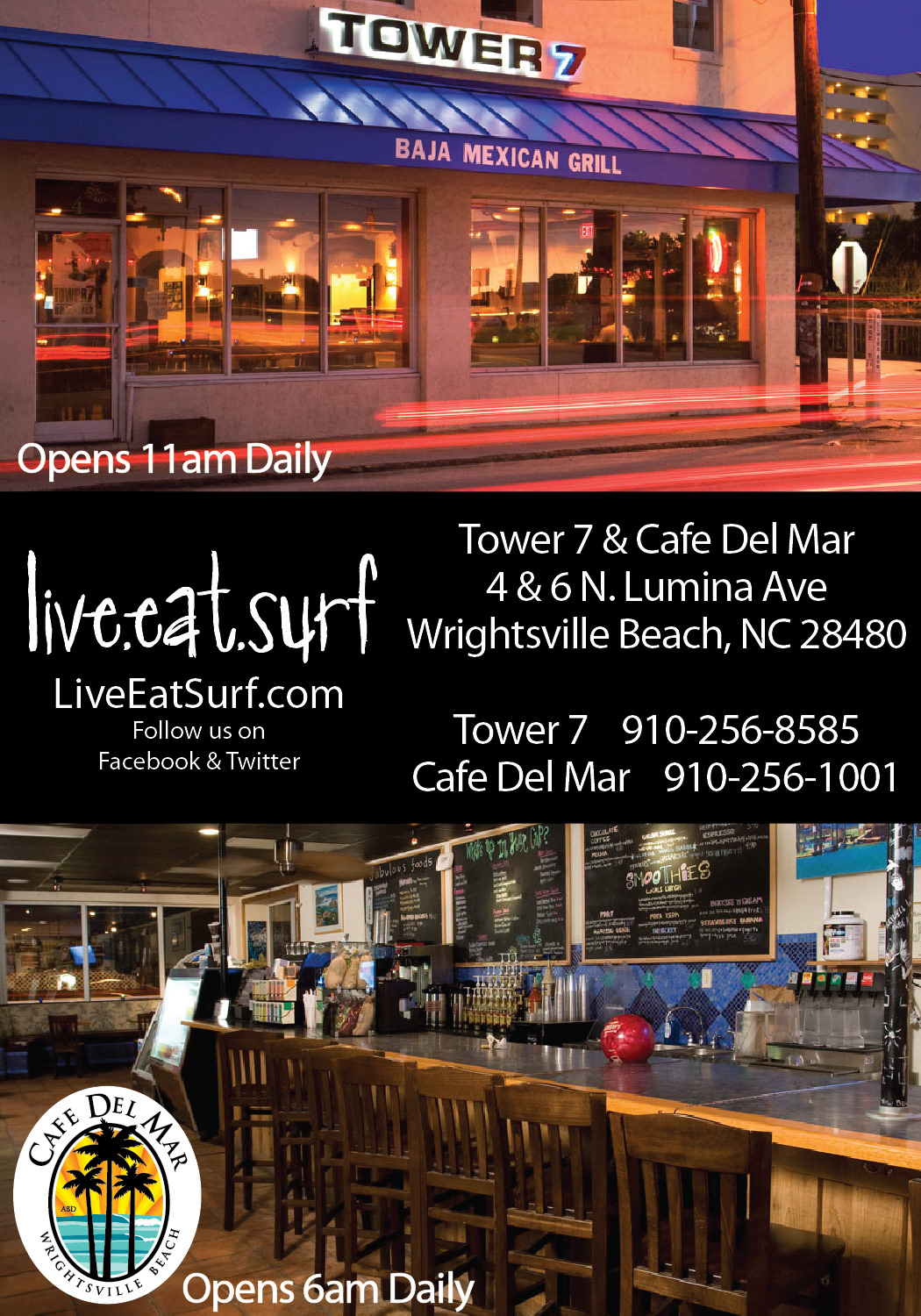 1/4 Page promotional ad for Tower 7 & Cafe Mar to be featured in a Wrightsville Beach hotel's guest books.